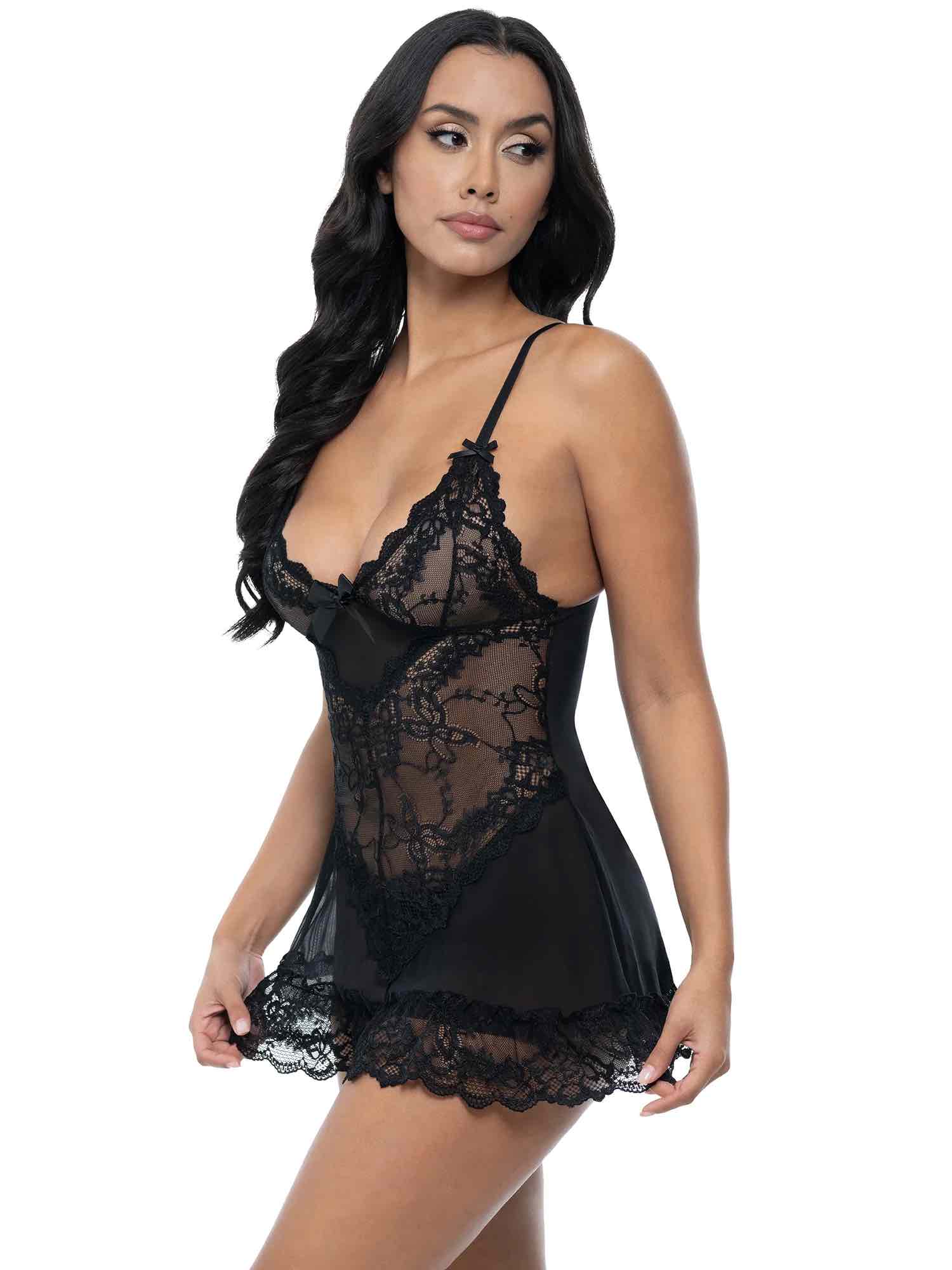 Turn up the romance any season with the Valentine Lacey Babydoll. This stunning A-line lacy babydoll features a seductive triangle cup bodice made from ultra-soft fabrics, ensuring all-night comfort on Valentine’s Day or any day. Adjustable elastic shoulder straps allow for a personalized fit, while the sheer mesh body with lace inserts and flirty ruffled hem adds an elegant touch. The charming bow detail at the center-front, paired with a matching G-string makes this set irresistible. Available in multiple fun colors in standard and plus sizes, this Valentine lace babydoll is the perfect choice for a special night in.