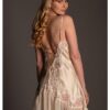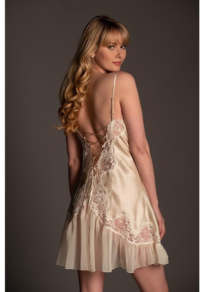 Lace Up Back Chemise with a Satin bias cut panelled bodice and Georgette skirt, appliqued lace around the satin bodice. The flirty Chiffon skirt adds flounce and is open at the back.