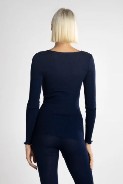 Women’s long-sleeved shirt made from a blend of wool (70%) and silk (30%), an ideal combination for a versatile and refined garment. The rib-knit fabric is designed to adhere smoothly to your body, creating a “second skin” effect that ensures comfort and warmth without weighing you down. Wool provides you with excellent thermal regulation, retaining warmth on cold days and promoting the skin’s natural perspiration. Silk, on the other hand, adds softness and a slight sheen to the fabric, making the women’s top feel pleasant against the skin. The finished hem adds a touch of elegance, while the absence of side seams prevents any irritation, making this long-sleeved top ideal for everyday wear. Perfect as an undergarment for winter or as an undergarment, this women’s top is a must-have for those who appreciate quality and functionality in a winter garment.