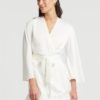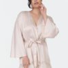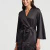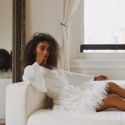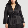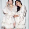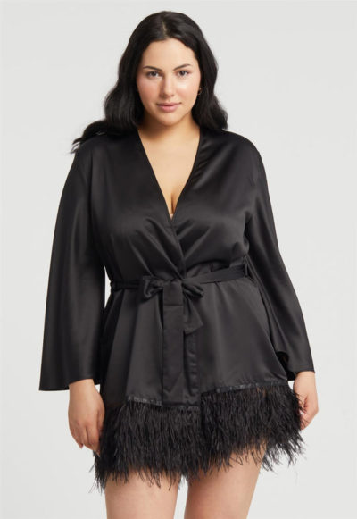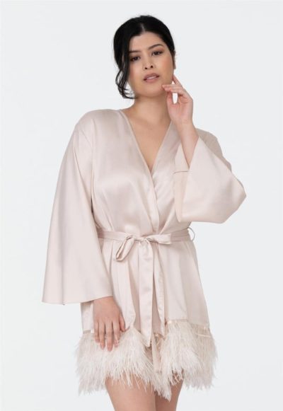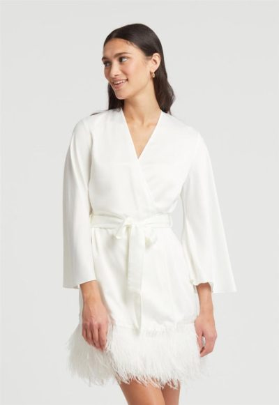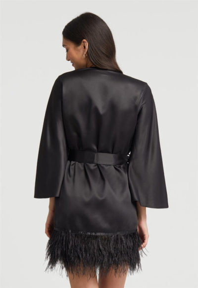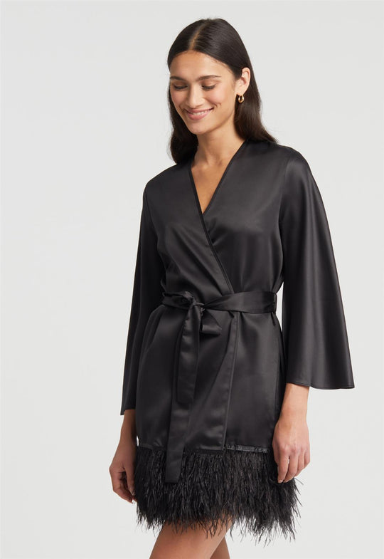 Bring your fantasies to life with the incredible presence of the Swan Cover Up. This lustrous poly-charmeuse cover up creates a flirtatious ambiance thanks to the beautiful ostrich feathers around the bottom hem. Details: Poly-charmeuse fabrication Three rows of ostrich feather detailing Poly-charmeuse belt ties center front. Ethically made. Cruelty-free.